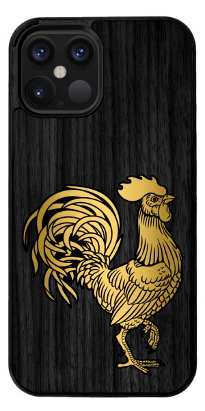 Case compuesto por lámina de madera de nogal con mancha obscura, incrustaciones de Láser foil especial para grabado láser en tonalidades dorado y plata