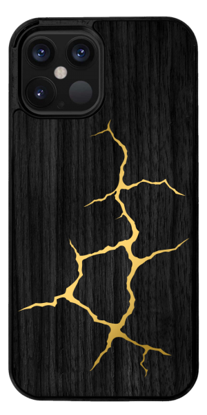 Case compuesto por lámina de madera de nogal con mancha obscura, incrustaciones de Láser foil especial para grabado láser en tonalidades dorado y plata