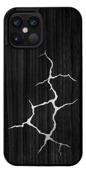 Case compuesto por lámina de madera de nogal con mancha obscura, incrustaciones de Láser foil especial para grabado láser en tonalidades dorado y plata