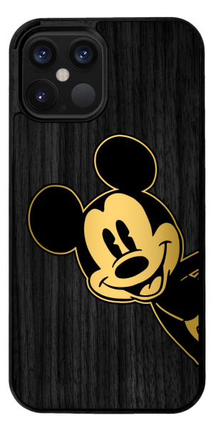 Case compuesto por lámina de madera de nogal con mancha obscura, incrustaciones de Láser foil especial para grabado láser en tonalidades dorado y plata