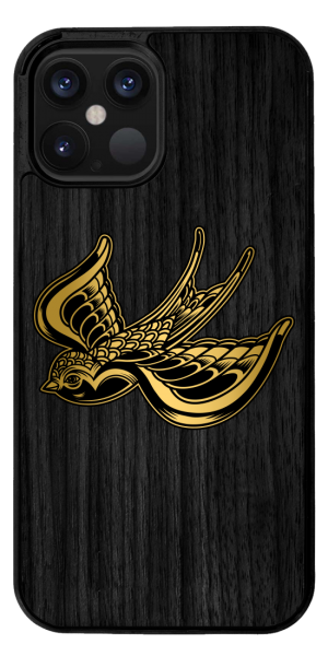 Case compuesto por lámina de madera de nogal con mancha obscura, incrustaciones de Láser foil especial para grabado láser en tonalidades dorado y plata