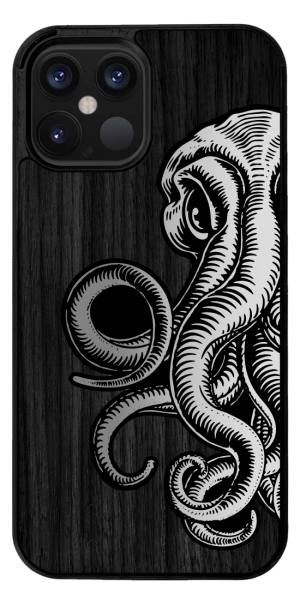 Case compuesto por lámina de madera de nogal con mancha obscura, incrustaciones de Láser foil especial para grabado láser en tonalidades dorado y plata